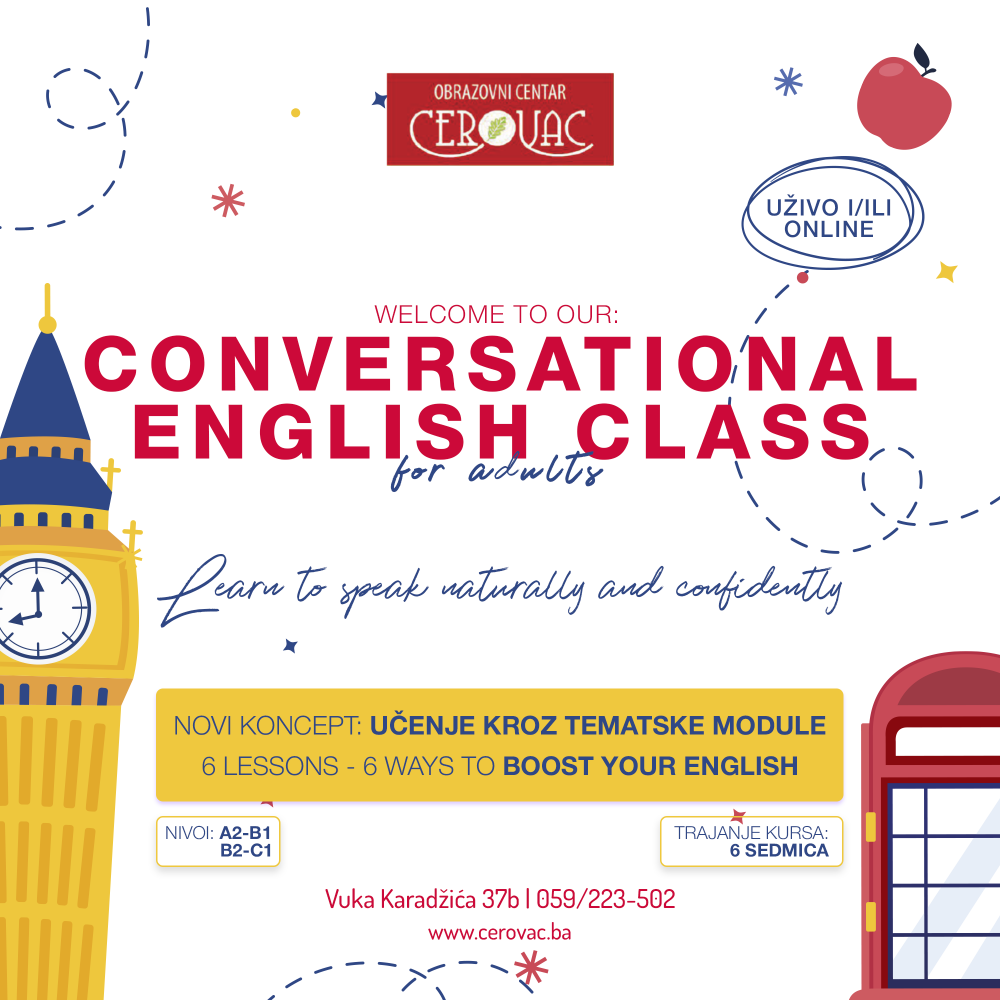 Novi kurs konverzacijskog engleskog jezika u Obrazovnom centru Cerovac, namijenjen odraslima koji žele da unaprijede svoje komunikacijske vještine kroz praktične i tematske module.